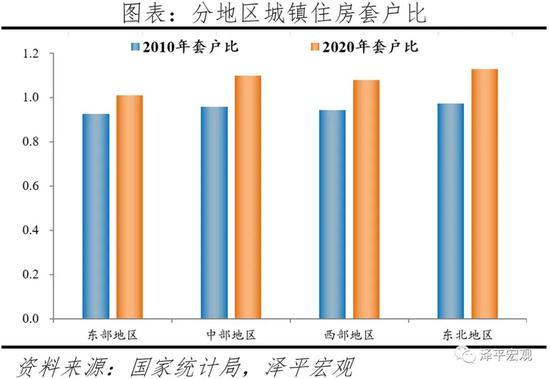 从城镇套户比看,东部、中部、西部、东北地区分别为1.01、1.10、1.08、1.13,青黔赣黑4省套户比超过1.15,沪粤京等5省低于1.0。分地区看,东部、中部、东北地区分别为1.01、1.10、1.13,西部地区为1.08。分省看,2020年青海、贵州、江西、黑龙江4省城镇住房套户比超过1.15,吉林、内蒙古、河南等9省套户比在1.10-1.15之间,山东、湖北、西藏等9省套户比在1.05-1.10之间,湖南、四川、江苏等4省套户比介于1.0-1.05之间,广东、上海、北京等5省套户比在1.0以下。