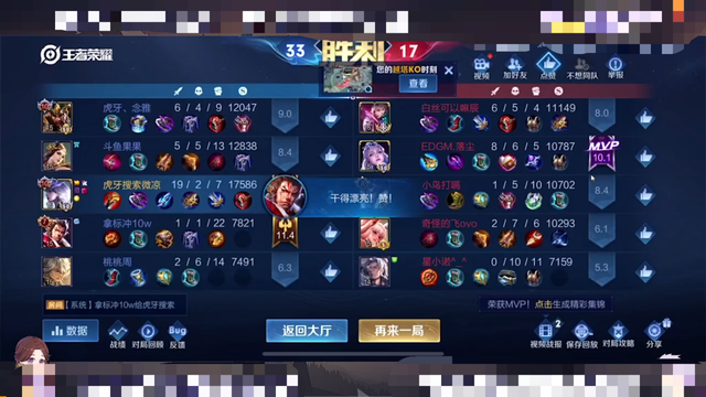 一直到后期大伙都以微凉为主要核心,而微凉本身也是依靠团队而战,除了两波团战中被强杀以外,后期镜满装备直接秒杀后方脆皮轻松取胜。而游戏结束的时候微凉也是以7/2的优秀kda获得16的超高评价。如此优秀,为了直播不被搞心态北慕也只能暂时屏蔽微凉了。