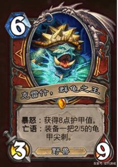 本身3/9扎实的身材,9血很容易就触发暴怒效果,而暴怒效果非常强力,直接能给战士叠八点护甲。而且有着不俗的亡语效果,为你的英雄装备一个龟甲尖刺,超高的耐久可以帮你处理很多小生物,而且本身具有高贵的野兽属性。