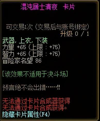 混沌居士清夜在武器、上衣、下装提供75点智力的增强,也是一张性价比非常高的卡片,对于新起的奶角色可以考虑附魔过渡。