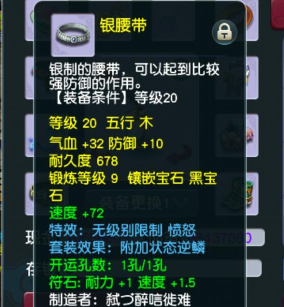 上面是一条20级的腰带,这条20级由玩家直接打造腰带现在拥有着无级别限制和愤怒双来者效果,而且还电话出来的逆鳞的变身套装,现在已经镶嵌了九级的黑宝石,这种腰带是不可能给低等级pk的玩家使用的,这种腰带就是给骷髅大唐使用的,因为这种低等级的无级别愤怒腰带的气血是比较低的,而且无限的镶嵌的黑宝石之后还可以提升自身的速度,能够保证自己在对方出手之前先使用横扫千军将对方放倒。