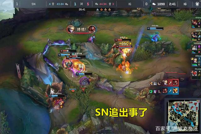 中期IG加快节奏,不断拿塔和小龙,18分钟就听牌龙魂,但是经济被SN咬得死死的。SN仗着有卡牌一直想搞事,只要卡牌一亮大招,Rookie就会TP过来保人,neny硬是一次都没死,IG抓死了SofM之后拿下龙魂。27分钟IG拿下大龙后撤退,SN优势追击反而被消耗,Wink的神圣分离者EZ战力很强,IG一换三大获全胜。