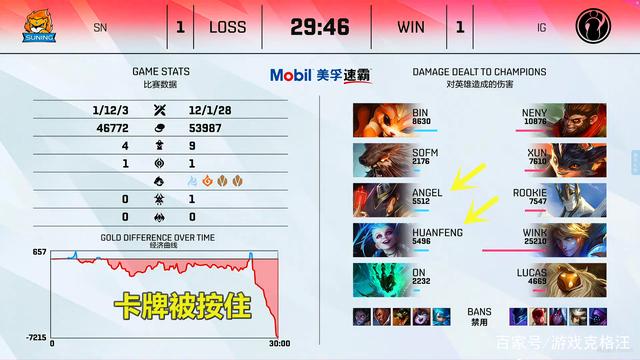 开局XUN就来中路gank,卡牌往野区跑但还是交代下来,在野区的SofM差点也被殃及,随后XUN入侵野区被抓,IG瞬间支援反打拿下ON人头,紧接着XUN游走中路再次抓死卡牌,Angel上把的卡牌节奏无敌,这局前期直接按死。SN选择继续阵容上路,Rookie又当爹又当妈,保着三路打,根本不给对方gank的机会,前期IG拿到些许经济领先。