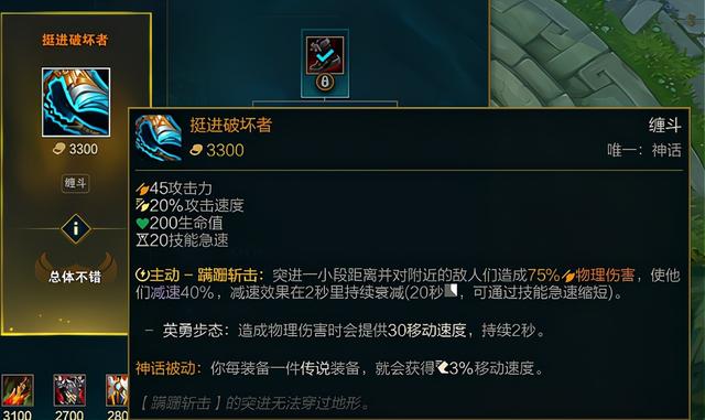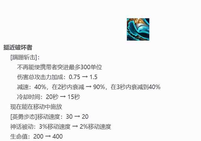以往的挺进破坏者几乎是上单AD坦克类英雄必备的,像诺手,这两个英雄几乎是是必出的,其他英雄例如奥拉夫,鳄鱼这些则酌情可出,因为挺进破坏者的主动效果是向前突进300码,弥补了这些短腿英雄的缺陷,并且冷却时间也不长。这次改动过后,挺进破坏者直接被移除了位移效果,并且神话被动的移动速度也削弱了1%,不少玩家戏称其为“原地破坏者”。