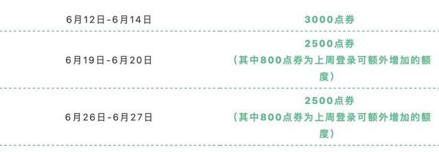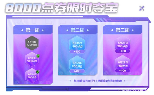 端午假期怎能少了点券呢?在6月12日-6月27日期间,车手们每周末在线登录即可领取对应点券,最高可领取8000点券。当周登录领取点券,即可为下周增加点券额度。车手们可以期待一下本周末的来临,领取更多点券吧~