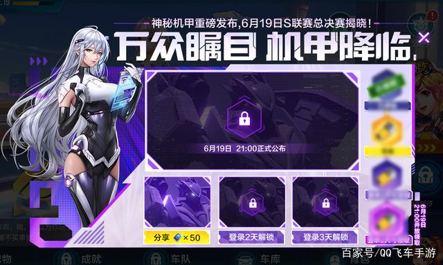 QQ飞车手游首辆神秘机甲的全貌,将会于6月19日晚S联赛总决赛现场揭晓~车手们需登录游戏,即可提前解锁机甲概念图,并解锁不同奖励。
