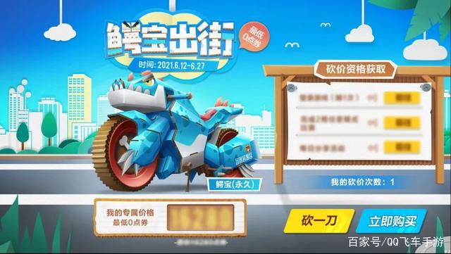 在6月12日-6月27日期间,车手们完成任务获得砍价资格,最低可砍至0点券抱走永久M1鳄宝。当未砍至最低价格时,也可以选择通过消耗点券来进行购买,同样可以获得M1鳄宝!