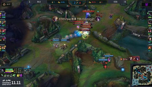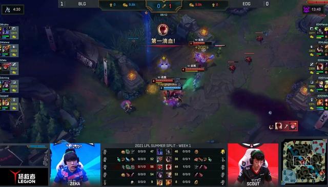 比赛前期:双方正常开局,BLG利用下路对线优势控下第一条小龙火龙;6分钟,EDG三人中路抓死佐伊拿到一血,但下路BLG也是还以颜色击杀Meiko日女;随后峡谷先锋争夺战,双方中路拉扯打出一换一都选择撤退;9分钟,BLG利用视野优势拿下第一条峡谷先锋以及第二条小龙风龙,此时双方经济基本持平!