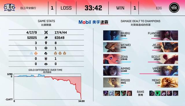 随后EDG利用优势在大龙坑打出一换三,成功拿下大龙;33分钟,EDG带着大龙buff中路推进,利用装备经济优势丝毫不给BLG机会,推掉BLG中高地后,直接选择开团,打出零换五后,一波结束比赛,恭喜EDG扳回一城!