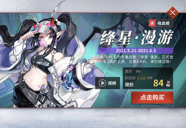 这个皮肤是式神吸血姬,在8套皮肤中最吸引人的一款。吸血姬的皮肤多是和服,一点新鲜感都没。要知道和服的皮肤太多了,吸血姬作为小萝莉,和服皮肤算不上最好看,虽然价格都不怎么贵。这套漫游最有特点,双马尾的辫子,二根筋的小背心,多么有青春活力。