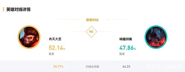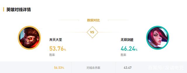 猴子的胜率有53.76%,剑姬则只有46.24%,看似没有拉开太大的距离,但是大家看下面的对线单杀率,猴子足足有56.53%啊。