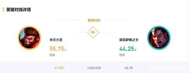 虽然说诺手也必出黑切,但猴子的灵活性,随便躲诺手的外圈Q啊,并且诺手想跑都跑不了。看看这个数据,对线44.25%的胜率,42.15%的单杀率,被猴子远远抛在脑后了。