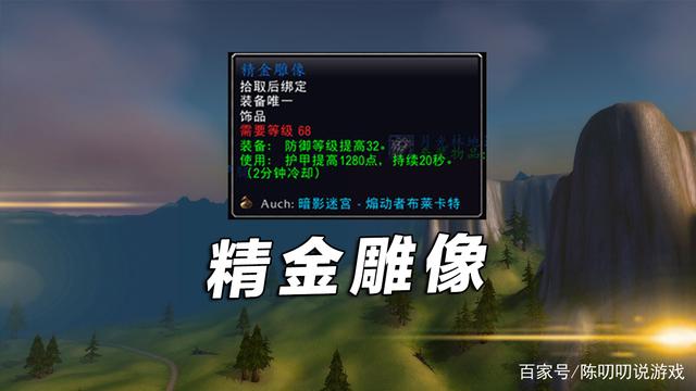 第六款是精金雕像,增加32点防御等级,使用后可获得1280点护甲,持续20秒。这款饰品在装备都成型的后期用处不大,但在前期还是非常不错的饰品。暗影迷宫二号BOSS掉落,同样是普通和英雄难度均会掉落。