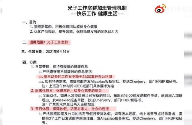 据介绍,腾讯旗下光子工作室群提倡“快乐工作,健康生活”,要求员工保持有规律的健康作息。加班机制中要求员工在周三以外的工作日,必须早于21点离开办公区域。同时,公司保障员工双休,严格按照法定节假日休假,如果因特殊情况需要加班,必须提前向领导申请并阐明理由。
