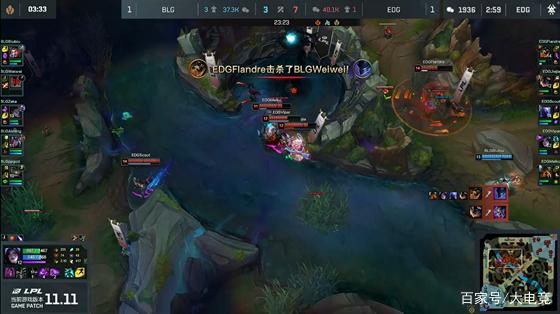 27分钟BLG抱团推进中路,佐伊催眠气泡睡到兰博,BLG选择主动开团,用芮尔换掉了兰博的人头,但后续盲僧二段Q进场摸眼R闪踢回秒杀了卡莎,失去核心的BLG兵败如山倒,被EDG斩杀四人!30分钟EDG在野区反手击退想要先手的BLG,拿下大龙Buff后又击杀BLG三人。