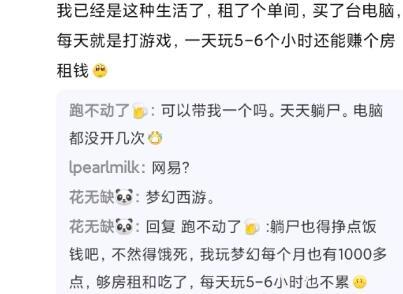 现在躺平这个词汇很流行,已经有很多年轻人表示自己要躺平了,而上面的这位玩家应该就是梦幻西游的躺平生活吧,上面的这位玩家表示自己租了一个单间,买了一台电脑,每天就是打游戏,一天玩5到6个小时还可以赚房租钱,这样他可以天天在屋里呆着,但是小编想问一下上面的这位玩家有没有考虑过以后?现在虽然过得很滋润,如果哪天梦幻西游倒闭了呢,他这样的生活还能不能持续下去?