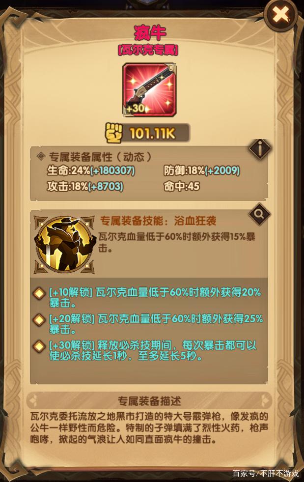 +10:瓦尔克血量低于60%时额外获得20%暴击。+20:瓦尔克血量低于60%时额外获得25%暴击。+30:释放必杀技期间,每次暴击都可以使必杀技延长1秒,至多延长5秒。