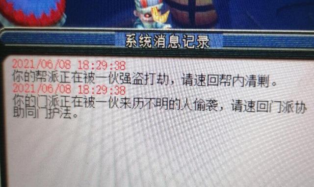 每天中午12点以后玩家的门派和帮派都是有可能出现入侵者事件的,上面的这位玩家就同时触发了门派入侵者和帮派入侵者,出现这种情况你们要选择守卫哪一个?守卫门派入侵者有可能只能击杀1到2个怪物,守卫帮派入侵者有可能会击杀很多强盗,但是现在帮派的强盗必须组队才能够切入战斗,所以单开玩家组队的可能性会更小一点。