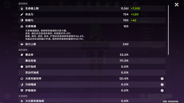在这些圣遗物加持下,我的90级0命姥爷的属性是这样子的:天赋8/8/8,攻击力(双火buff)3007(武器狼末),暴击65.4,爆伤154.1,物伤83.3,其余精通充能啥的就不重要了。