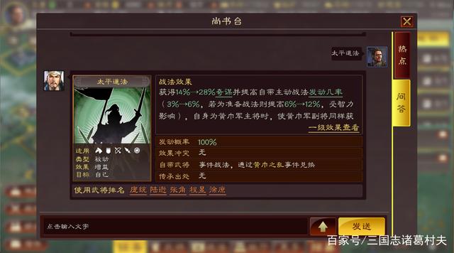 首先是程昱,我们给其携带的战法是太平道法,四面楚歌,兵书选择虚实,以治击乱,鬼谋,妙算,加点全智。