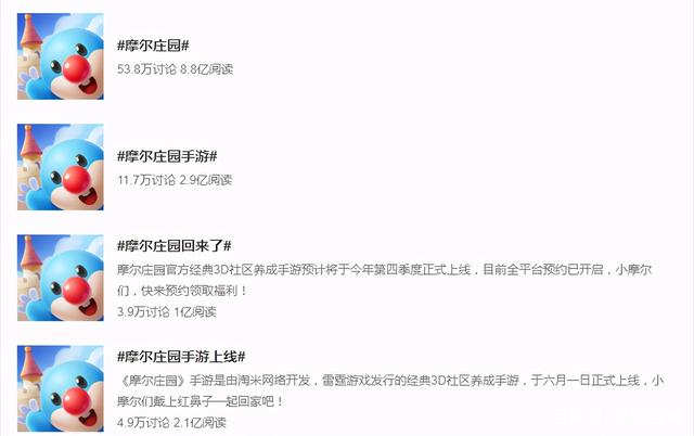 微博上关于摩尔庄园、摩尔庄园手游、摩尔庄园下雨、摩尔庄园烟花等每个话题都是以亿为阅读单位。