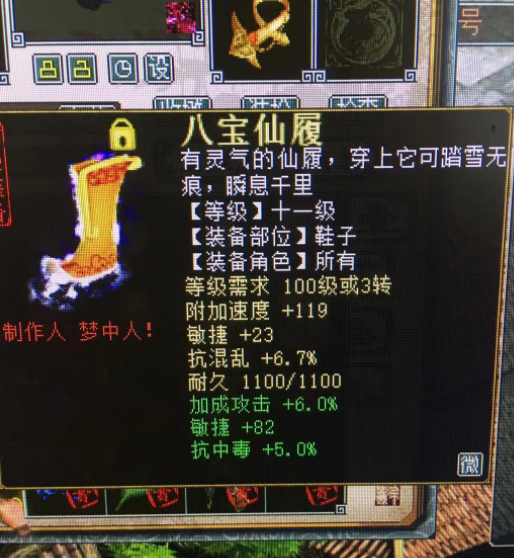 说了半天武器了,再来看一双11级的鞋子,之前我们聊过几双高等级的鞋子,属性足以与藕丝相媲美,最近又有位玩家炼化出来一双高敏鞋子。23的底子加上82的敏捷炼化,整双鞋子敏速224,这属性还是很不错的,有一股小藕丝的意思,小伙伴们,你们怎么看呢?欢迎大家在评论区留言讨论。