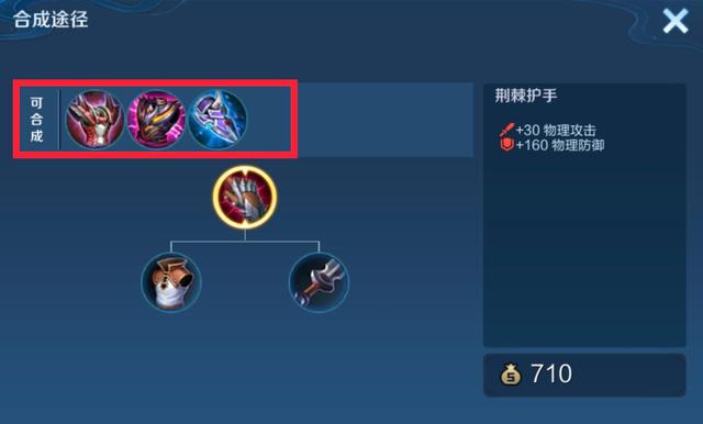荆棘护手可以合成反伤刺甲、暴烈之甲、冰痕之握,反伤刺甲如今已经成为物理英雄的标配,甚至某些射手英雄选择半肉装备,也会选择反伤刺甲。