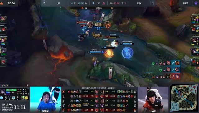 比赛中期:UP四人中路越塔开团,反被FPX支援赶到打出一换二,FPX顺势拿下第二条小龙土龙;16分钟,UP利用中上兵线优势拿下第二条峡谷先锋,并在中路找到机会打出一换四,SMLZ再次拿下双杀,UP顺势下路放出峡谷先锋推掉FPX下二塔,并拿下第三条小龙火龙;22分钟,UP众人入侵FPX红buff野区,小C锤石开团率先被秒,FPX想趁胜追击,但SMLZ厄斐琉斯力挽狂澜,伤害爆炸,UP直接反打出二换五团灭FPX,顺势拿下大龙,此时UP经济领先6000左右,局势一片大好!