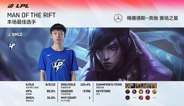 比赛后期:UP带着大龙buff拿下第三条小龙水龙,三小龙听牌,并带着兵线下路打出二换二推掉FPX下高地,转头中路推进,FPX眼看大势已去,再次选择开团,但奈何SMLZ经济装备领先太多,UP先后团灭FPX后,中路一波结束比赛,恭喜UP扳回一城!