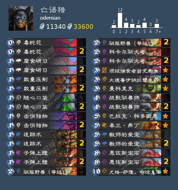 点评:本以为是娱乐卡组,结果实战却强得离谱,新卡【毒蛇花】盘活了猎人原本就有的11突袭召唤手段,解场能力大幅提升,而【随心口袋】除了配合【子弹上膛】,还能在1费时使用补充【毒蛇花】(0费必出),10费找暴龙王或者红龙斩杀,9费找【恩佐斯宝石】复活亡语,灵活性相当高,实在打不过了还能丢导演赌命,兼顾娱乐性和强度,极力推荐。