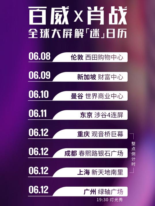 近日,肖战合作品牌百威官宣了全球大屏解迷日历,其中除了重庆、成都、上海以及广州四个国内的点外,还有伦敦、新加坡、曼谷、东京四个海外的点。目前“全球游”首站伦敦已经成功解锁,肖战的宣传广告已经成功在伦敦西田购物中心的大屏上出现。另外,为了这次的“全球游”品牌方还特地聘请了特邀摄影师前来助阵。
