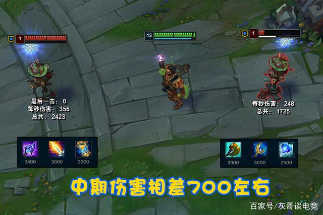 看到这里大家可能会有一个疑问:“现在这个版本,三件套游戏可能就结束了,即便后期再强那也是梦想而已。”那么“折磨流”维克托中期的伤害如何呢?通过下方这组对比图我们就可以得到答案,中期主流出装与半肉出装一套技能的伤害差距在700左右(假人血量为2000、双抗为70),其中很大一部分领先都在大招上,但实战中大招很难全部命中,在只用Q、E拉扯输出的情况下差距其实并没有很大,打脆皮绰绰有余。