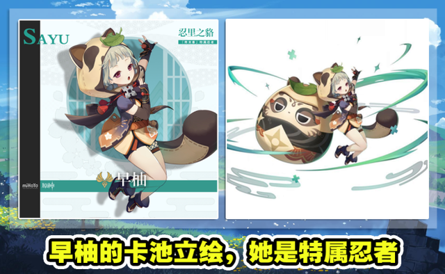 第二位新角色是早柚,又是一位小萝莉,风系角色。早柚是率属于终末番的忍者,逃跑、变幻、隐匿等技能都已经达到了大师级,一片树叶、一个水桶,都有可能是早柚幻化的。但是早柚也有一个始终无法突破的弱点,那就是身高,早柚自己也很介意,她相信通过睡觉可以补充长高需要的能量,于是她总是找机会偷懒睡觉,她一身藏匿的本领,就是因为要躲起来睡觉而练就的。立绘中的早柚带着一个浣熊头套,技能可以召唤一个浣熊达摩,大概就是下图中那样。