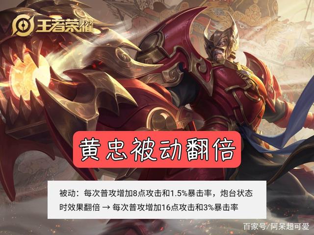 然后再来看看黄忠的调整内容,作为一名老将,这次也是直接增加了黄忠的被动效果,相比原来属性提升了一倍,比如每次普攻只能增加8点攻击力的提升至16点,而1.5%的暴击率也提升至3%的暴击率,炮台状态下不受影响。