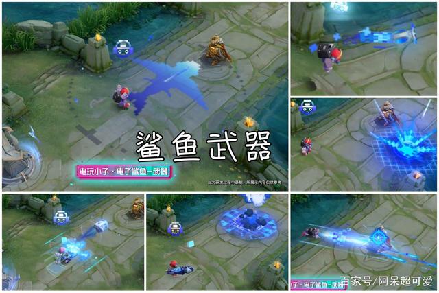 除了以上两套星元皮肤之外,鲁班七号还有1件专属武器,这些专属武器名字叫【电子鲨鱼】,透明的外观,拥有独特的技能特效,应该是90紫星币1件,而它的技能特效主要以蓝色为主,虽然非常像素化,但是这个蓝色也代表着海洋,非常符合这款武器的背景。