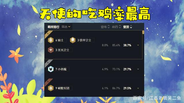 虽然被黑夜屠龙亚索、魔女刺客卡特天克,但天使依旧是目前11.11版本中被公认的独一档阵容,有一位大神就是用这一套阵容登顶国服。大数据也显示,6骑士天使的吃鸡率最高。