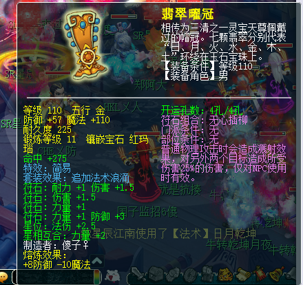 这件110级的女头,从属性来看是不错的。57加上8点的熔炼防御。魔法一共是加了100点。因为是大唐的帽子,那么肯定是要用溅射套了。