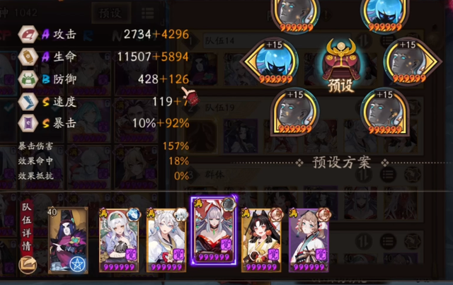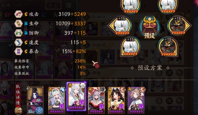 虽然我们不用千姬了,但是腹肌还是要有的,御魂选择雪幽魂四件套加荒骷髅两件套。二四六号位选择攻命暴,暴击要高,最少也要90%以上,效果命中尽可能堆高一些,根据自己御魂来搭配。