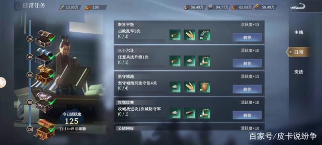 日常任务每天刷新,完成日常任务也可以获得大量的奖励,日常任务最后一个宝箱还可以获得一个兵家信物,用来获得兵法,从而提升实力。
