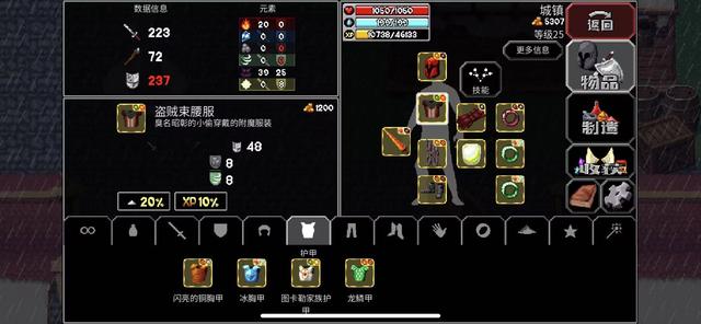 魔法洞穴中的护甲类装备要说最厉害的,那其实也没有,盗贼束腰服获取的难度也不大,玩家在六七十层的宝箱内就有几率获得的,虽然它的臭名昭著的小偷穿戴的附魔服装,但是属性上一点也没有差。四十八店的防御值外加八点的土属性防御、风属性防御,防御层面在那一方面真的没的说,百分之二十的物品掉落几率、百分之十的经验加成,这是附魔后的效果,在这之前的图卡勒家族护甲还是有点差距的,再往上应该有超过它的装备。