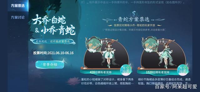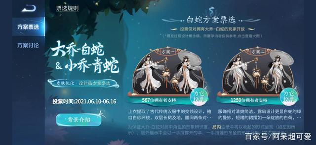 除了以上新皮肤的爆料内容之外,青白蛇皮肤优化之后的形象也得到了曝光。这次还是有两种投票方案,玩家可以进行投票选择,票数最高的将会成为这款皮肤的形象。