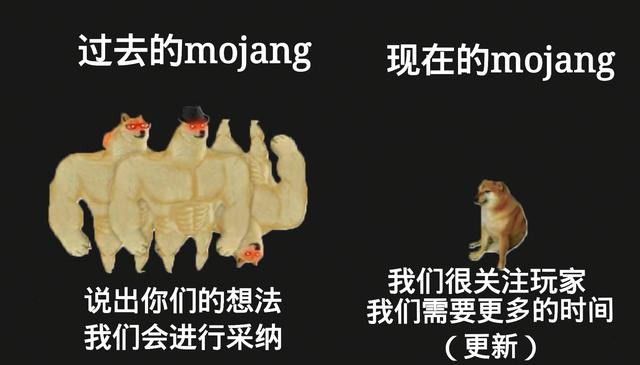 要想起游戏中的更新,玩家们会不自觉的想到mojang大大。从最大的反差,则是mojang大大的更新计划。在刚开始时总是会不停地听取玩家的意见,不断更新。现在更新并没有那么频繁了,这也招人玩家们对mojang的不同看法,这张梗图也形象表达了这一点。