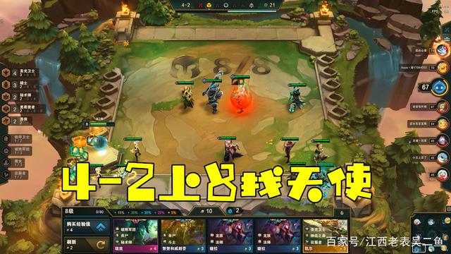 因为这一局有四家同行,我果断在阶段4-2上8人口(全场第一个上8人口),留30金币D牌找天使,发牌员是我亲戚,并没有让我失望,D完20金币后,如我所愿,天使出现了,2星天使随之诞生(两个妮蔻直接捏的),同行疯狂打问号。