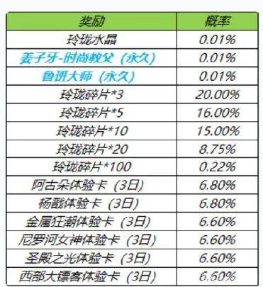 除了这个活动,体验服还上线了玲珑夺宝奖池的玩法,玩家们可以使用金币或者钻石参与活动中,抽取永久皮肤永久皮肤时尚教父或者玲珑水晶,而玲珑水晶可以兑换多款永久击败特效和回城特效。