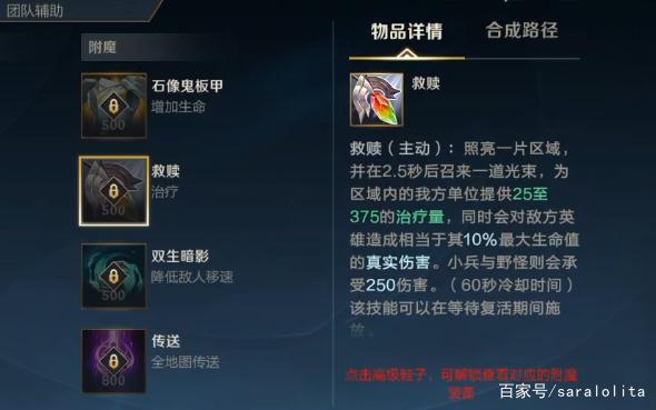 救赎:由于救赎有一个延迟施放的机制,所以出场率方面没有鸟盾那么高。但优点是群体治疗效果,并且能对敌人造成真实伤害,包括小兵和野怪。在目前版本的话,也有一些辅助英雄选择出救赎了。很多比赛中是打野选择出鸟盾,辅助出救赎,形成双重团队保护。