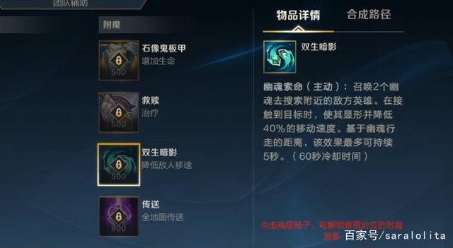 双生暗影:目前LOL手游中最冷门的一个装备附魔效果,反正笔者从去年玩到现在,可能没见到五次这件装备。双生暗影有探测视野和远距离减速的机制,但实际收益还是非常鸡肋,因为LOL手游打到中期的话,玩家都是抱团行动了。