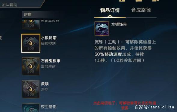 水银饰带:这件装备基本上成为了射手英雄的常用附魔选择,可以让你解除所有的控制效果,并且在1.5秒内提供移速加成。LOL手游未来的控制英雄越来越多,水银饰带的作用就越大。这件装备大幅提高了玩家的容错率,在比赛中常常可以看到。