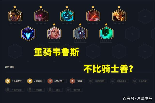人马、芮尔、贾克斯(重骑转职装备)、猪妹、泰坦、锤石、盖伦、诺手,组成4重骑、4骑士、2黑夜和3铁甲卫士的羁绊。