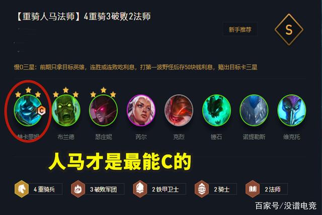 组成4重骑兵(人马、克烈、芮尔和猪妹);3破败军团(人马、三只手和锤石);2铁甲卫士(芮尔和泰坦);2骑士(锤石和泰坦);2法师(三只手和火男)
