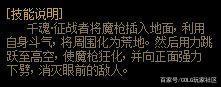 ◆从三觉演示动画与说明中,征战者拿的是魔枪,并利用斗气将周围环境幻为荒地,最后跃向空中施展强力下劈,话说这一段时间的三觉怎么都喜欢腾空下劈。